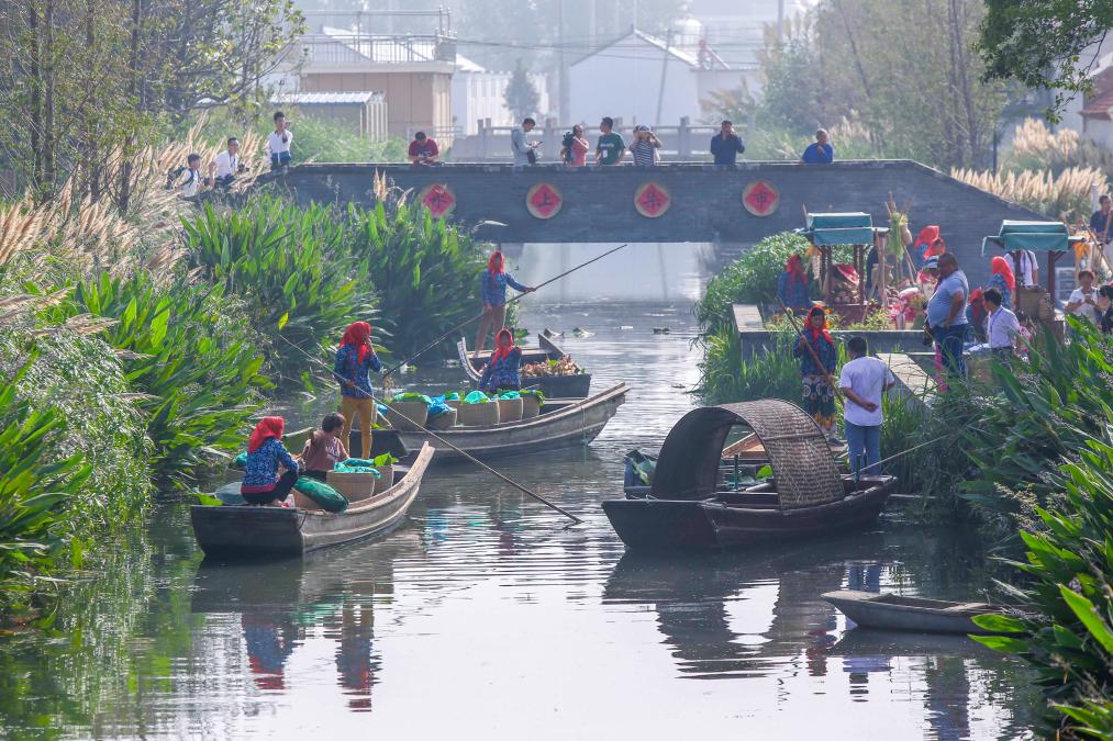 2018年9月23日,在江苏省兴化市东罗村举办的农民丰收节主题活动上,农民在“水上市集”展示特色农产品。新华社发(周社根 摄)